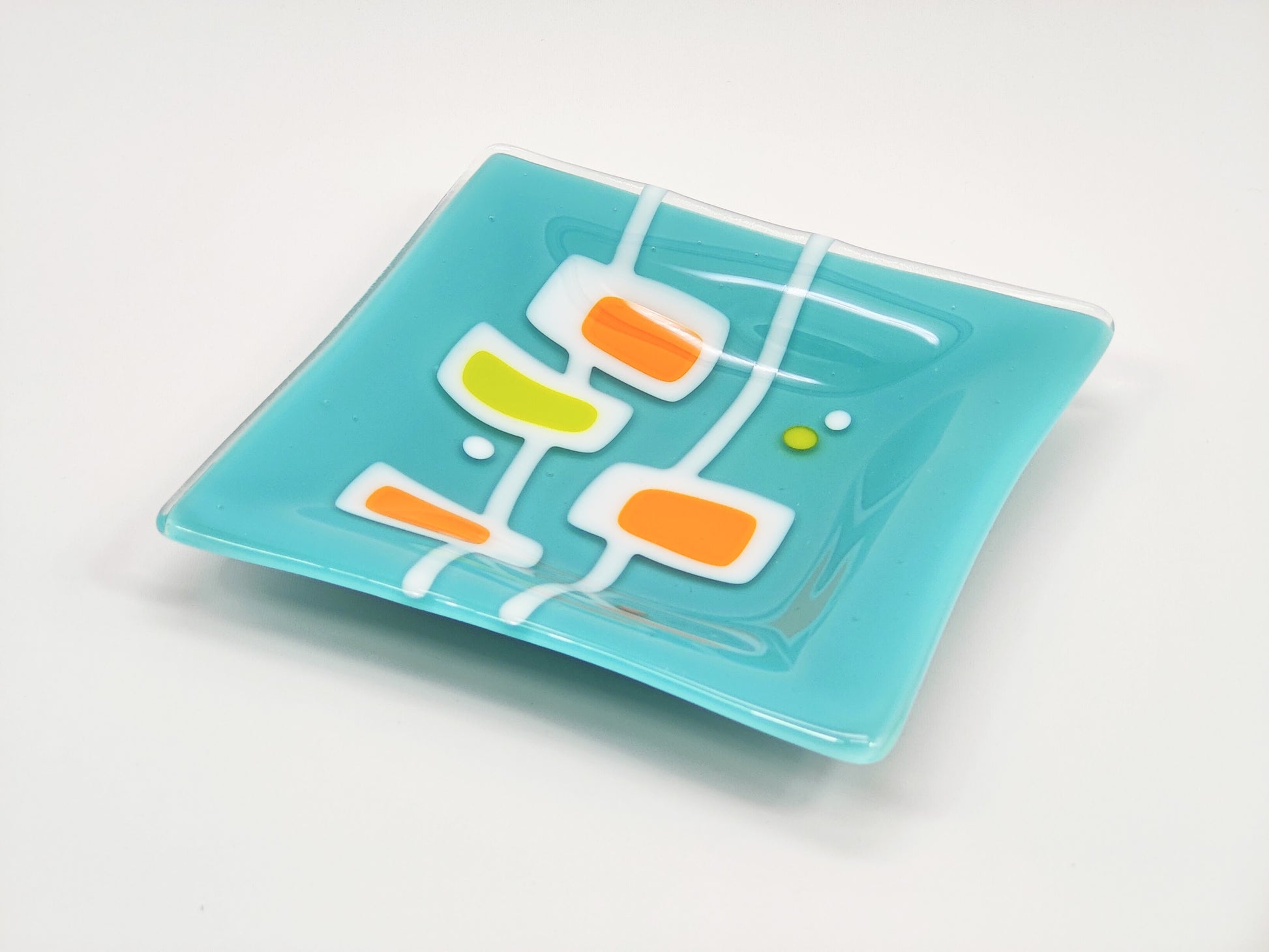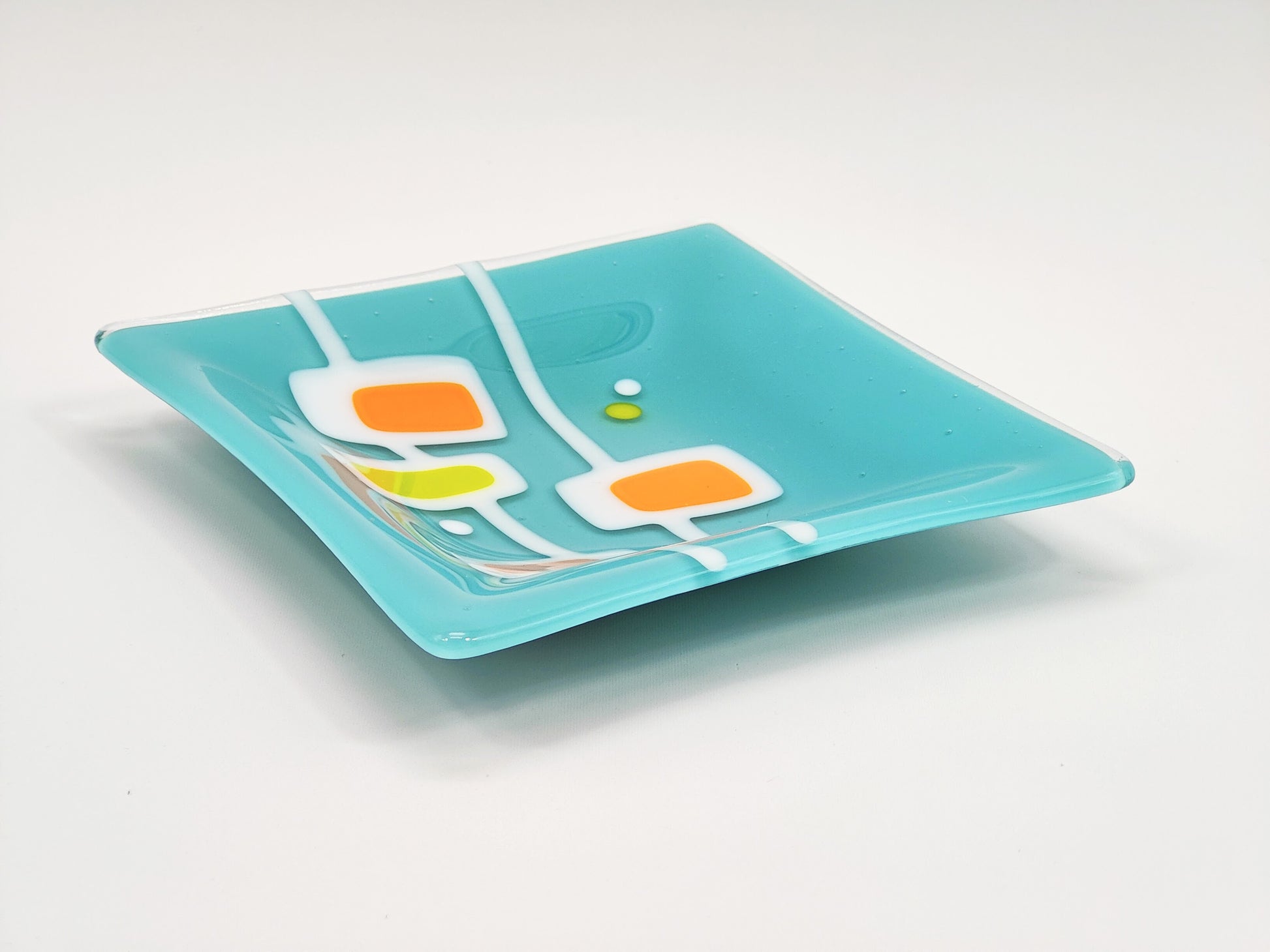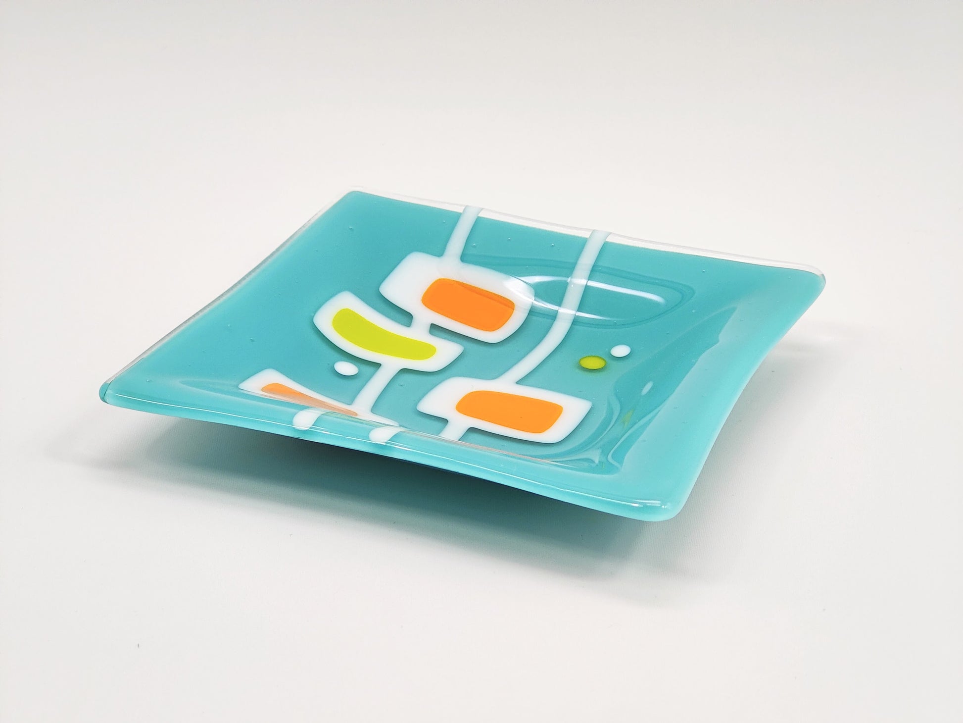 The only caution here is to not fall in love with a dish, because it can't love you back! This little plate can hold your jewelry or keys as well as it holds your attention. It can serve a sandwich as well as it serves the cocktail hour swank. It can look pretty on a shelf as well as it.... looks pretty on a console. Calming turquoise is contrasted with some bright green and orange pop!