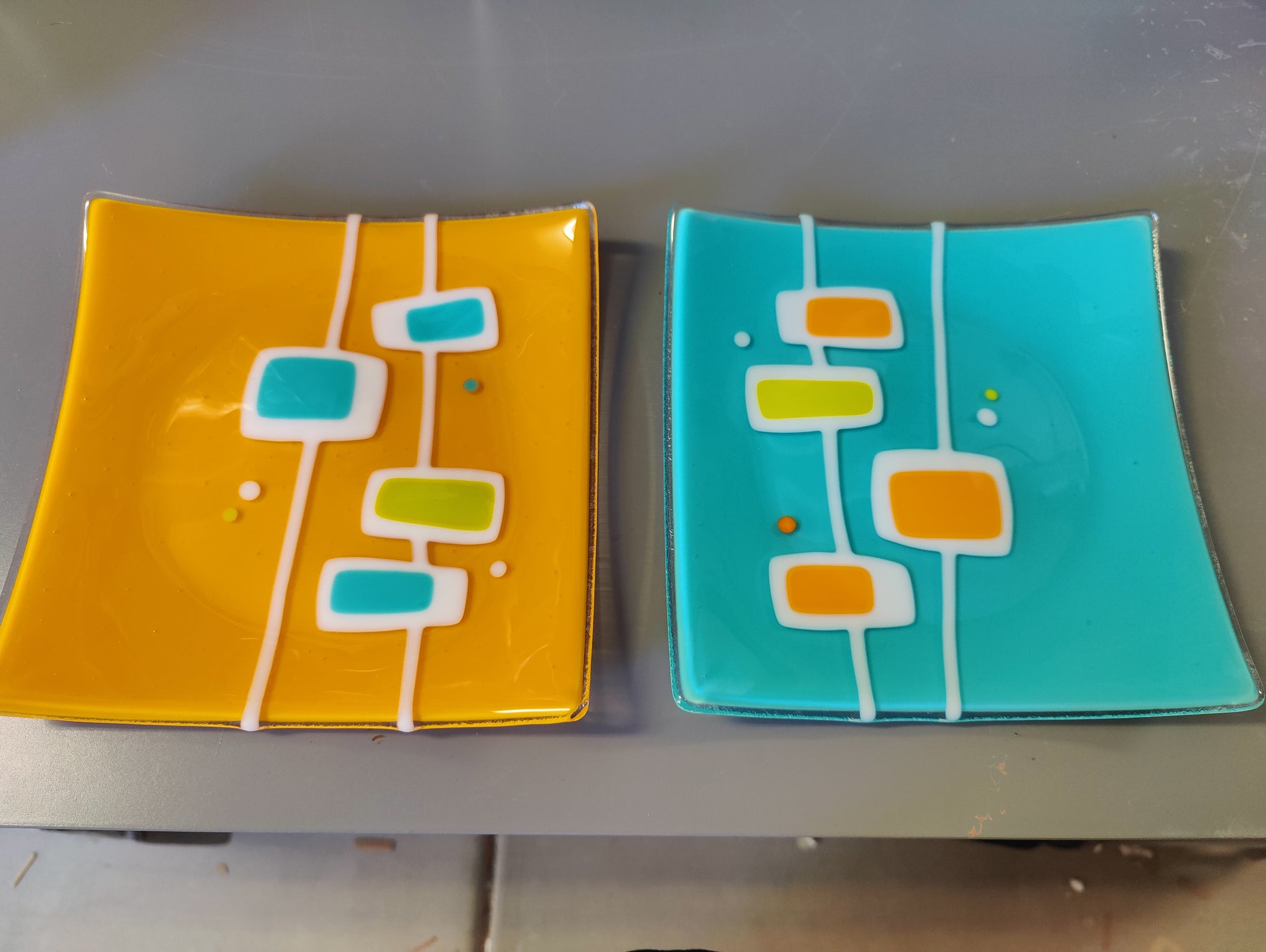 Handmade kiln-formed glass is an art and science that produces truly one of a kind pieces. Sheet glass, ground glass, powdered glass, metals, paints and enamels are formed together using myriad techniques and then fired up to 1500f for many hours -- often multiple times -- to achieve the beautiful, sometimes geometric and sometimes organic forms that are never *quite* perfect. Bubbles, soft lines, and uneven edges are often natural features of kiln-formed glass.
