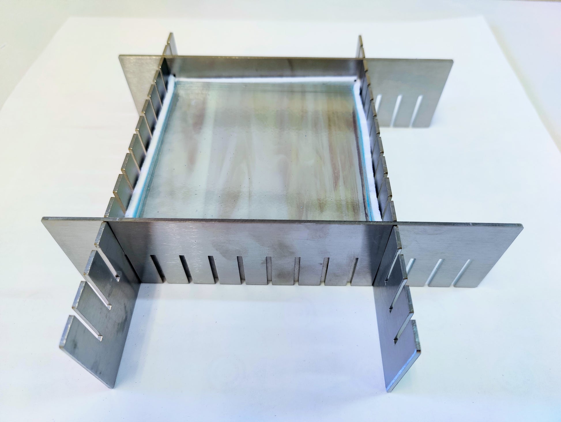 Depending on construction technique, it may be useful to assemble and line three sides of the dams, leaving one side open until filled with glass and adding the final lining and dam when complete. When doing this, ensure that the two end side dam slots are facing up so that the last dam can be lowered into place without disturbing the other sides.