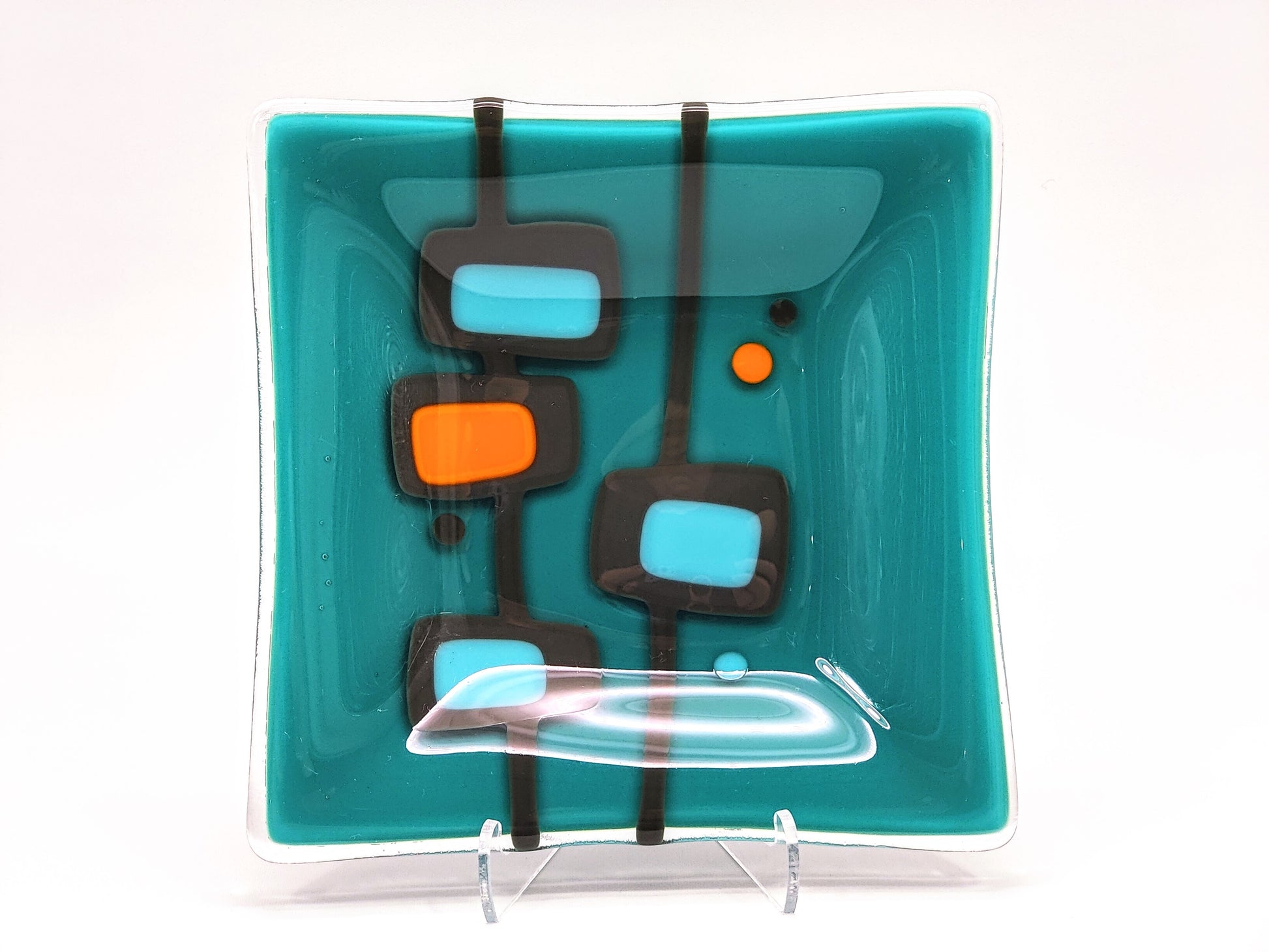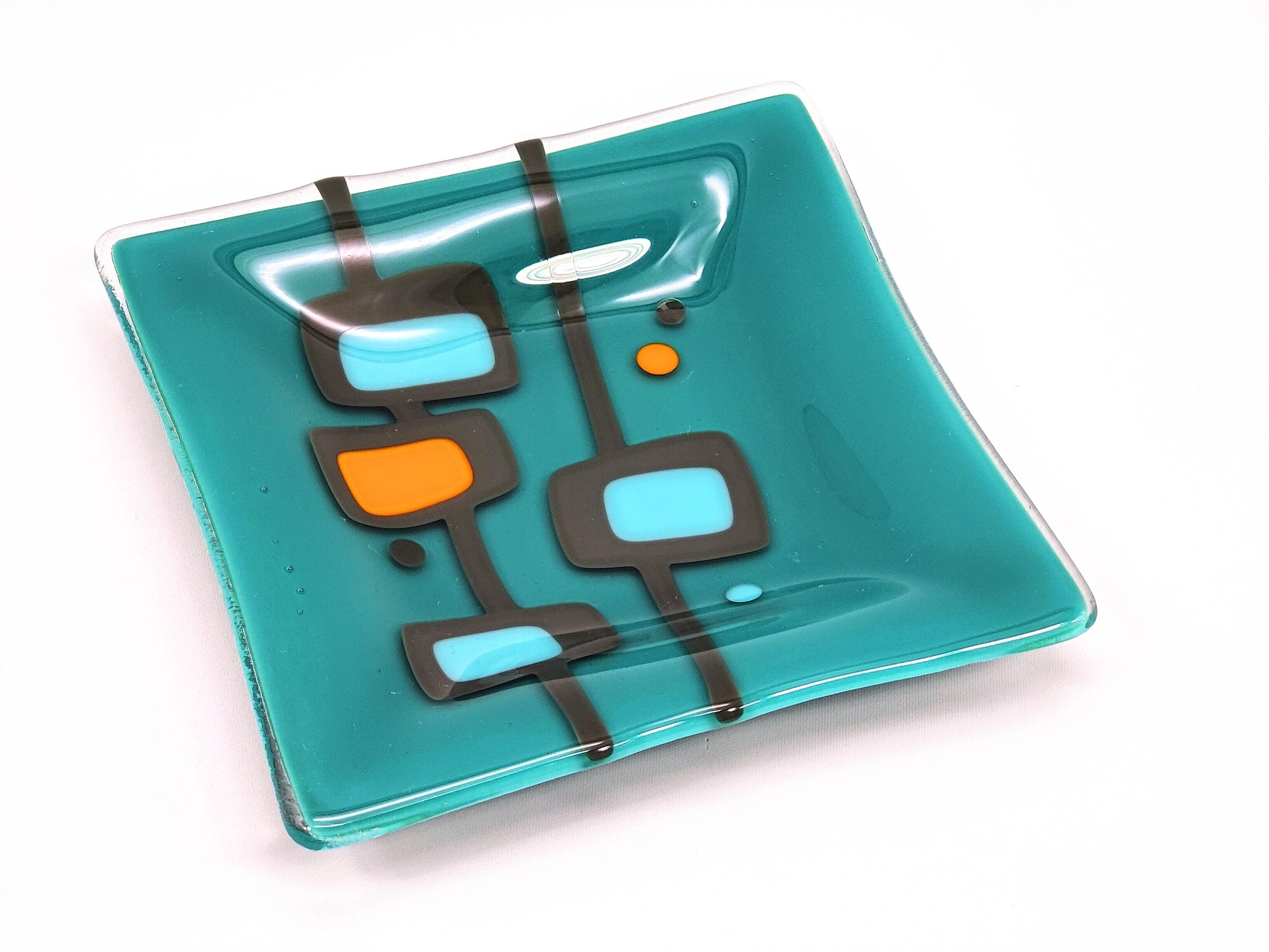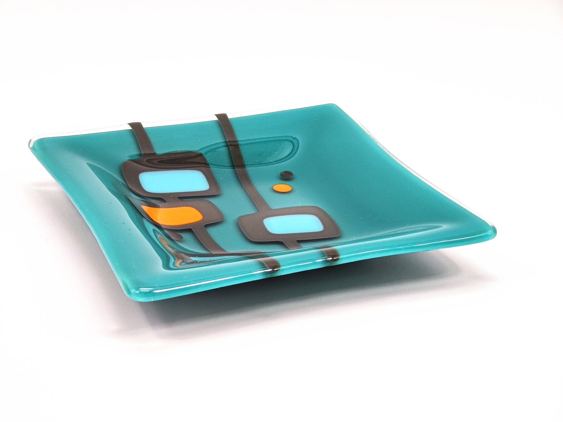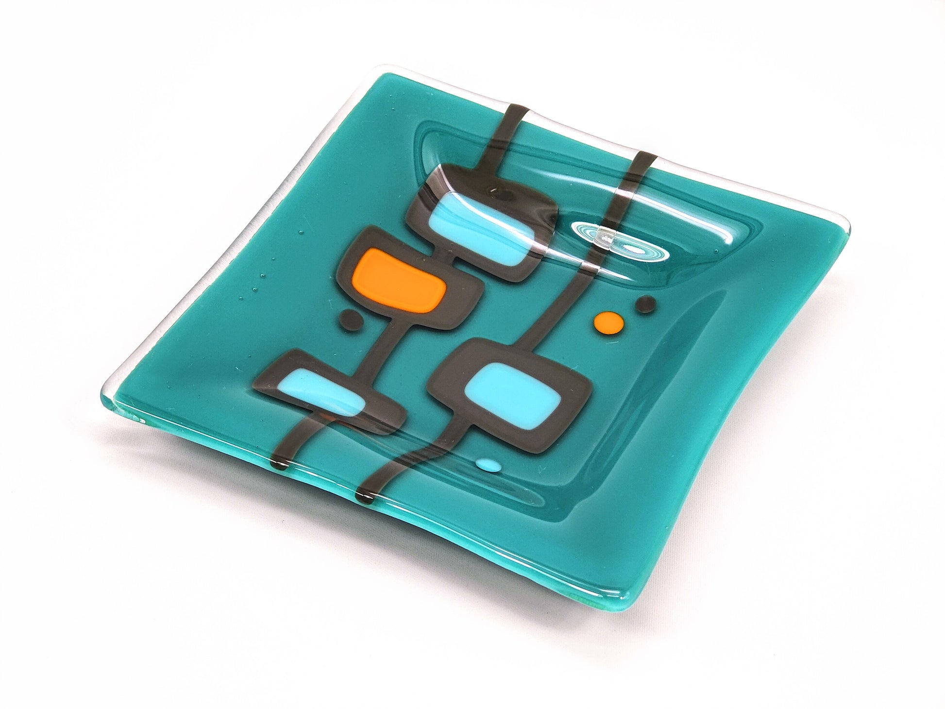 Handmade kiln-formed glass is an art and science that produces truly one of a kind pieces. Sheet glass, ground glass, powdered glass, metals, paints and enamels are formed together using myriad techniques and then fired up to 1500f for many hours -- often multiple times -- to achieve the beautiful, sometimes geometric and sometimes organic forms that are never *quite* perfect. Bubbles, soft lines, and uneven edges are often natural features of kiln-formed glass.