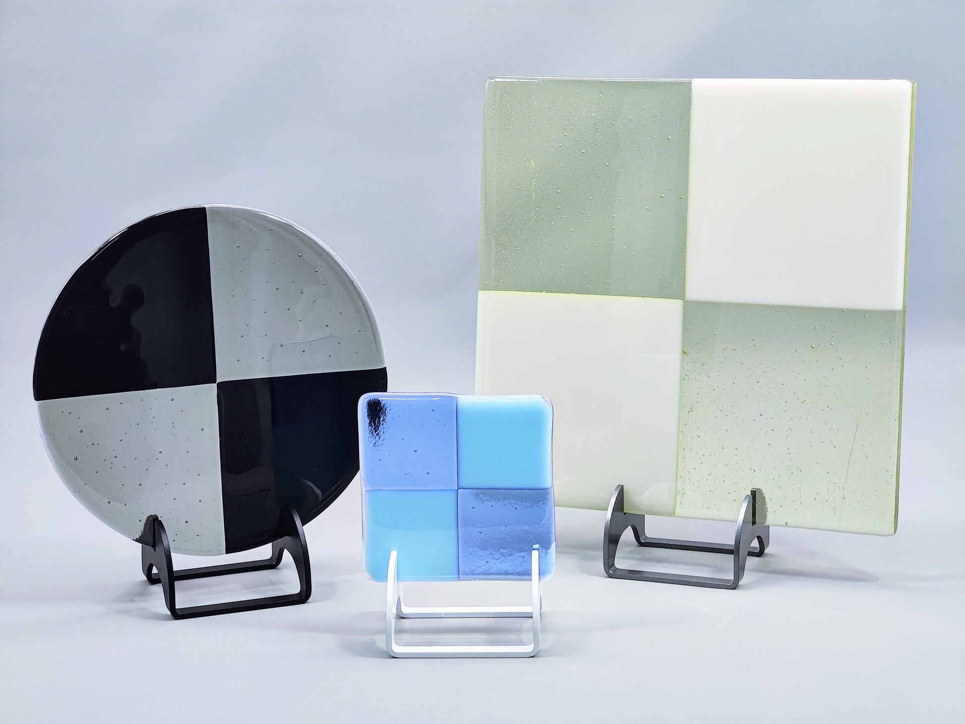 Let your art shine with this powder-coated aluminum display stand for flat kiln-formed glass art pieces; or any flat media! The sturdy, 1/8" thick 5052 aluminum elevates your piece vertically and showcases the glass while providing a sleek and elegant base. This stand can hold square, rectangular, circular or oval shaped flat pieces.